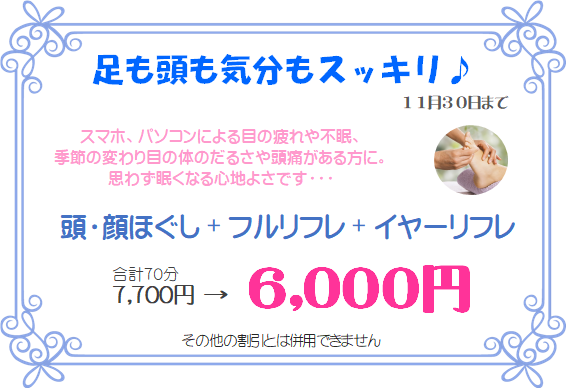 10月のキャンペーンのご案内です。 通常メニューにはない頭のお疲れがスッキリする特別なセットメニューをご用意いたしました。 2025年11月末まで その他の割引とは併用できません この機会に日頃のお疲れを取りにいらして下さい。 お客様のご来店を心よりお待ちしております。